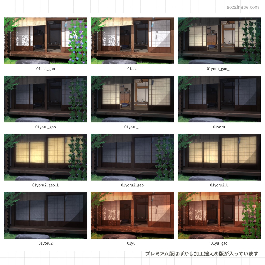 朝顔付きの夏差分、日中・夜・夕方の時間差分をご用意。夜ふすまの開閉差分もあります。